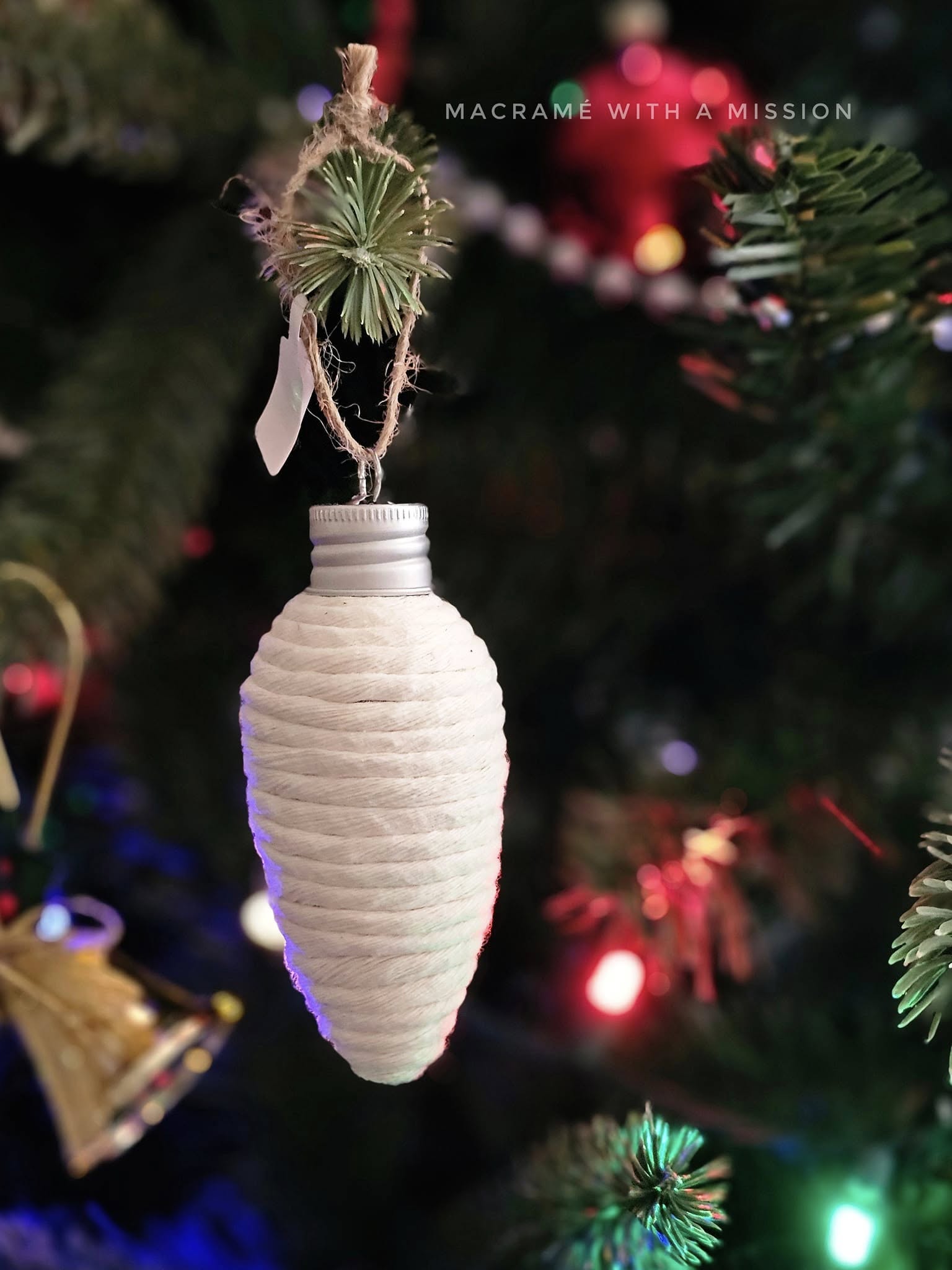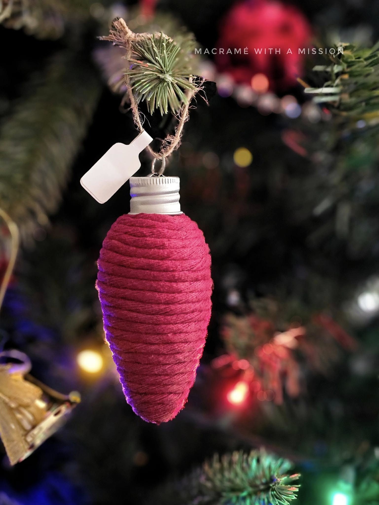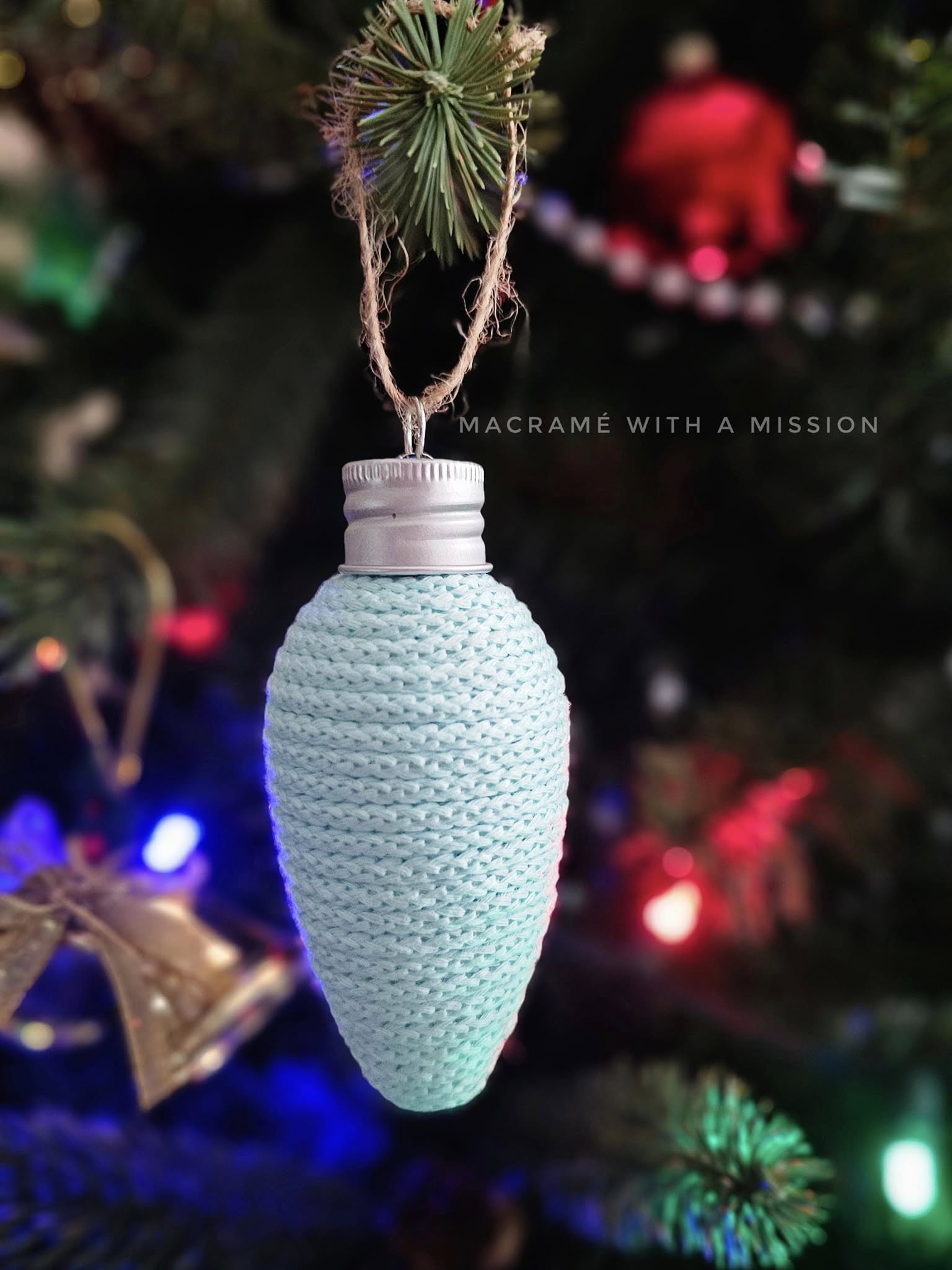 Decorate your Christmas tree with these adorable macramé bulb ornaments. The ornament measures 3.75 inches long and 1.5 inches wide not including the length of the twine hanger. Ornament can be made in any color that is available - see photo of color options. There is also a glow in the dark cord option. Made to order and order processing time is 2 weeks.