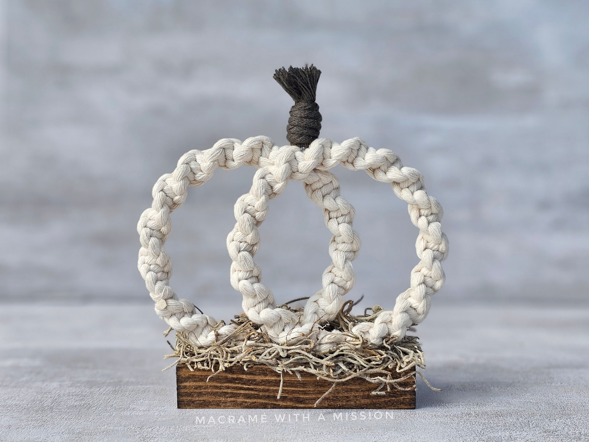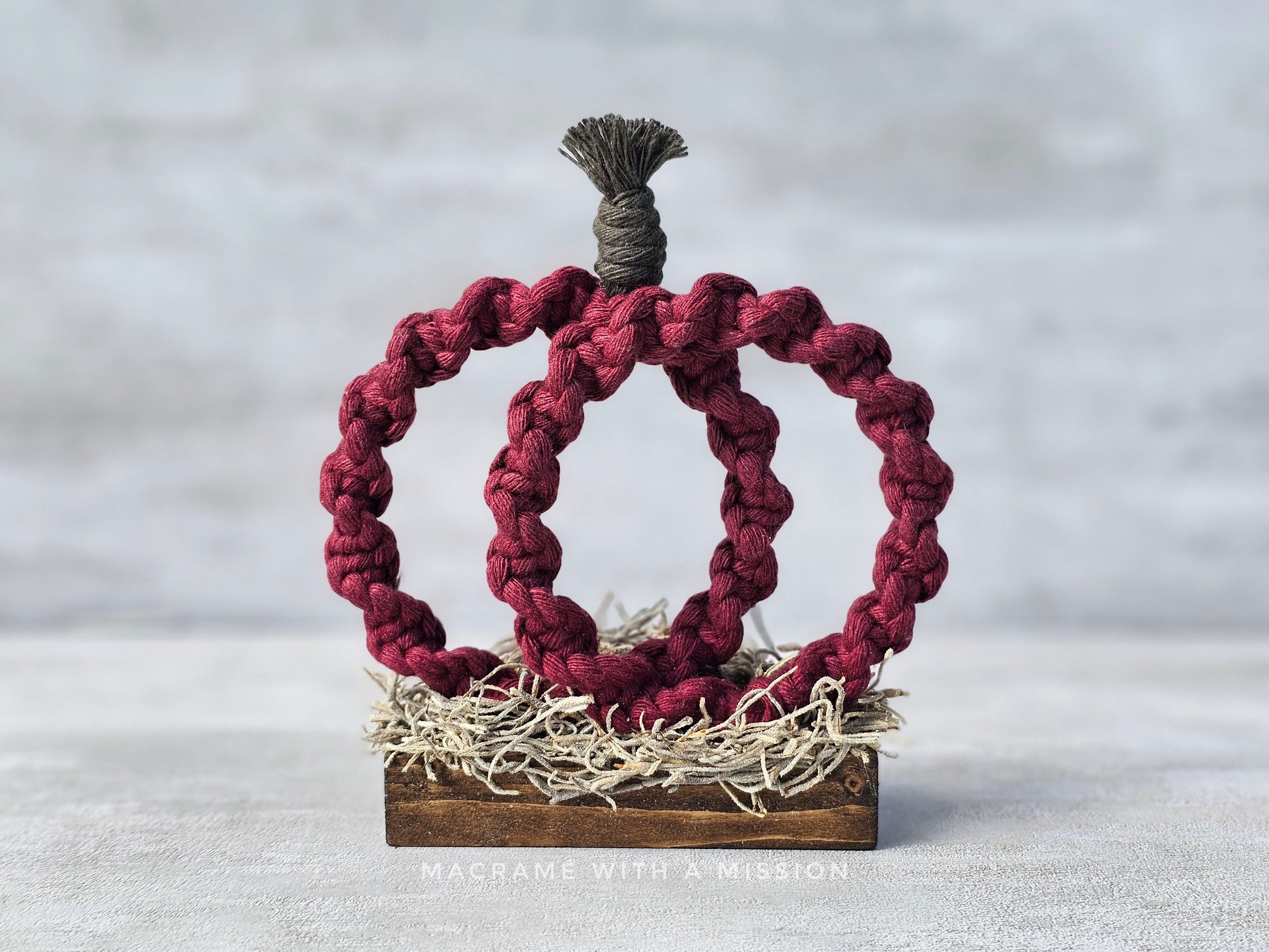 These pumpkins are a perfect addition to your fall decorations! They are made with soft cotton cord from Ganxxet, and attached to a stained wood base which makes it easy to place it anywhere. It measures 5.5 inches wide, 5.5 inches tall including the stem, and can be made in any color that's available. Made to order and processing time is approx. 2 weeks.