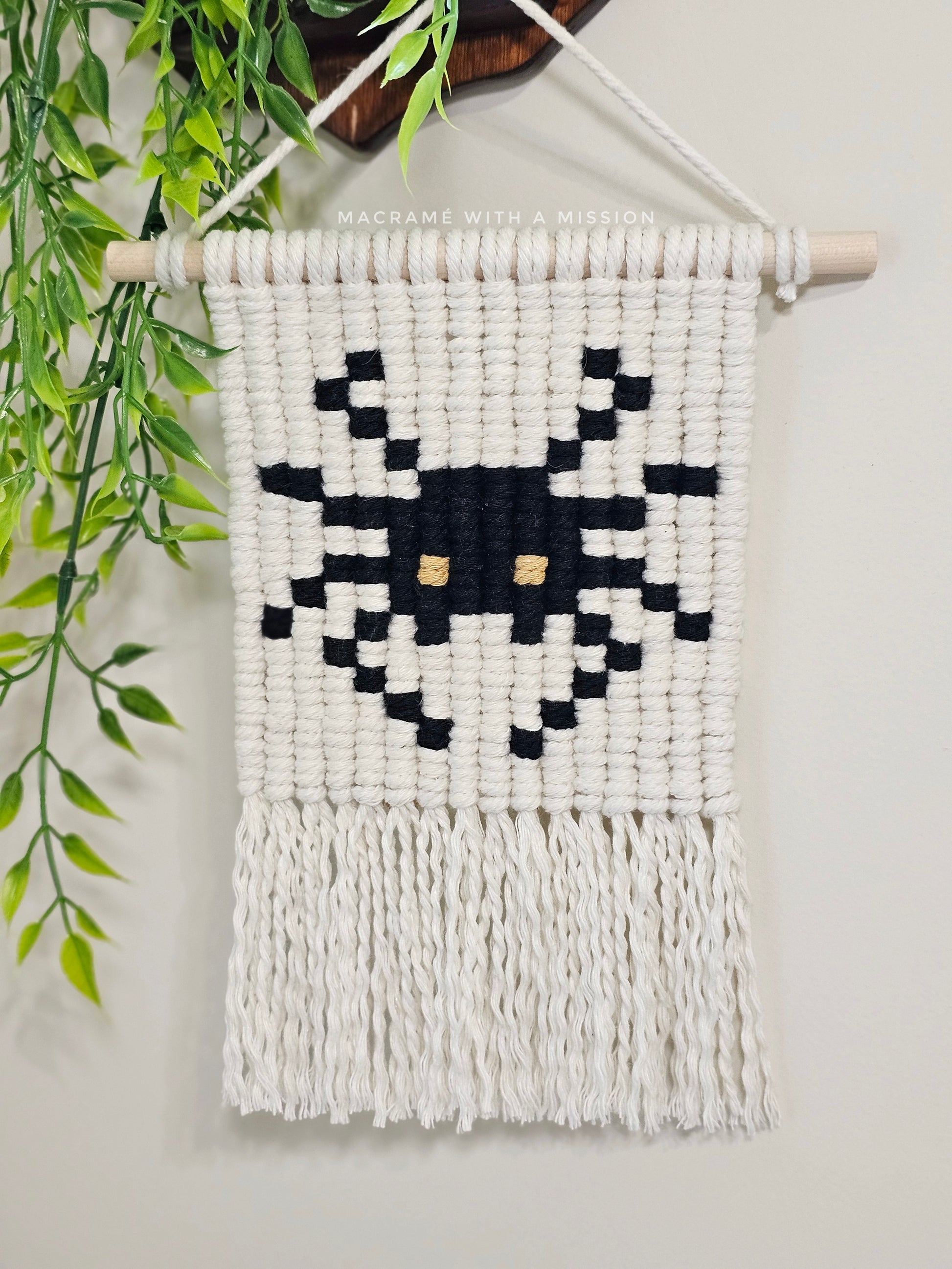 Bring a dash of Halloween whimsy to your space with this small, cutesy spider! Made in a pixel art style and measures approx. 8.5 inches long from dowel rod to end of tassels and 5 inches wide on a 7 inch dowel rod. Made to order and processing time is approx. 2 weeks max.